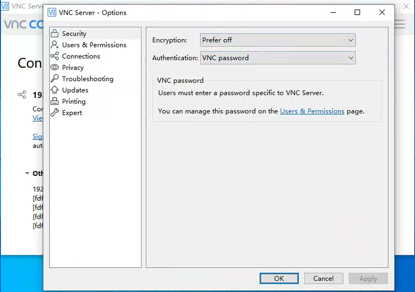 如果你使用VNC Server提供服务, 需要在设置页面“Security”页面将 Encryption 选为“Prefer off”以及 Authentication选为“VNC password”