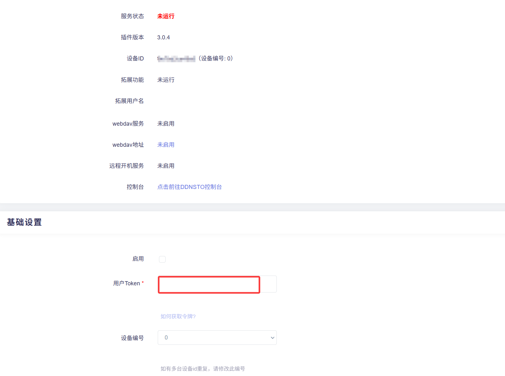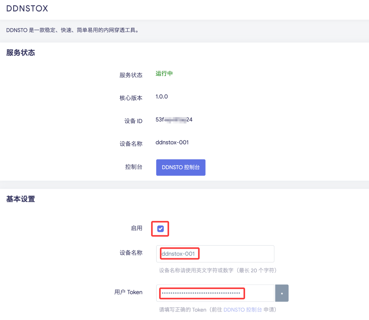 或者找到DDNSTOX,填写TOKEN,和设置设备名称,并启用。