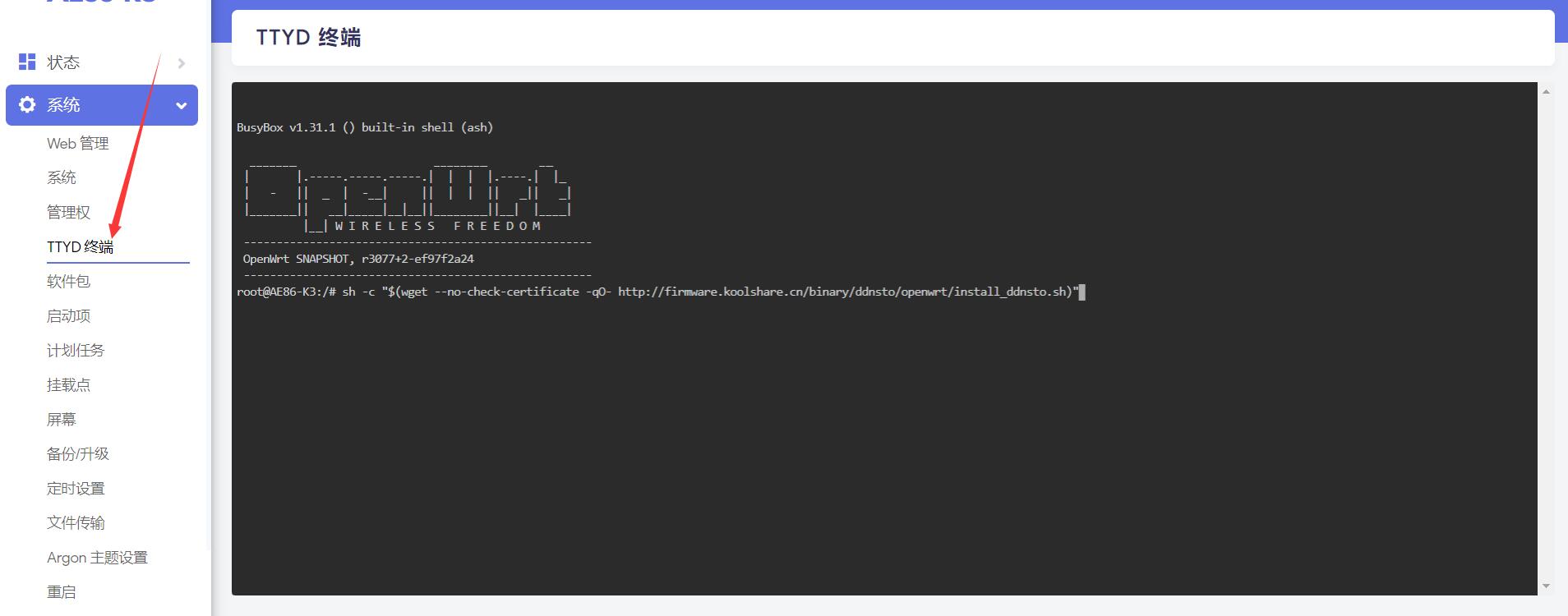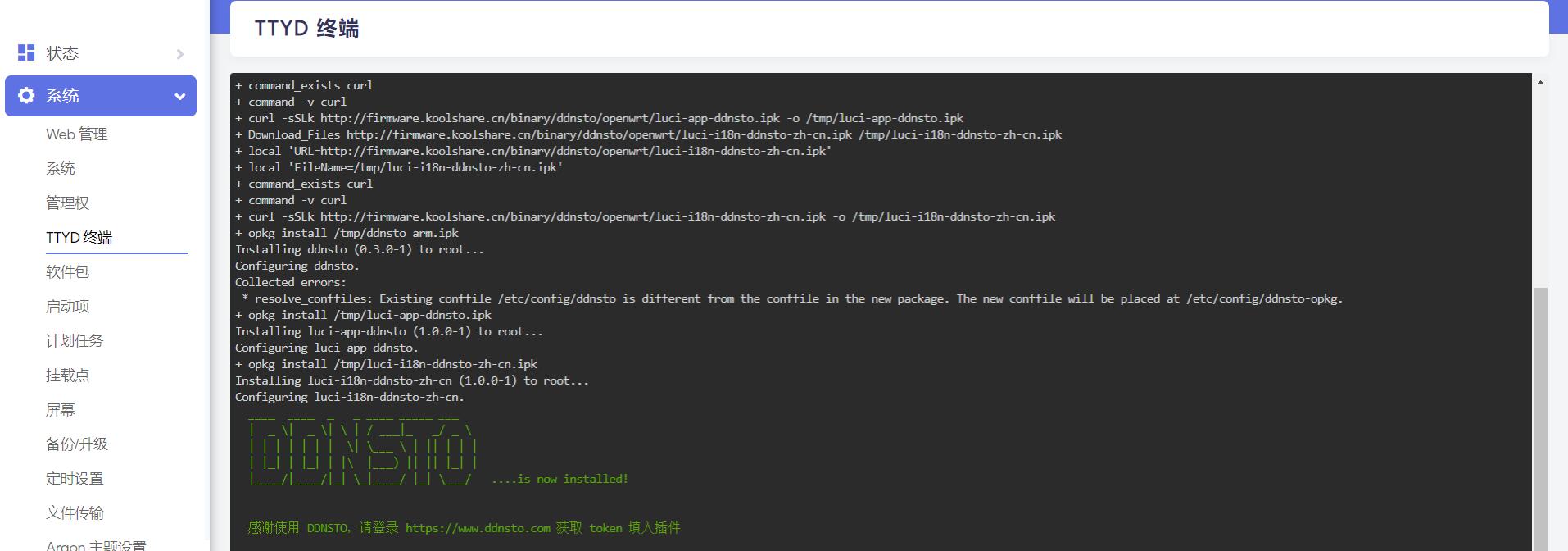 在OpenWrt TTYD终端中输入任一上述命令,会自动安装完成。