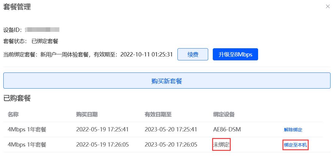 登录进ddnsto控制台,绑定好新设备后,右边会有“管理套餐”的图标,弹窗“已购套餐”未绑定设备的套餐,就可以绑定至本机。