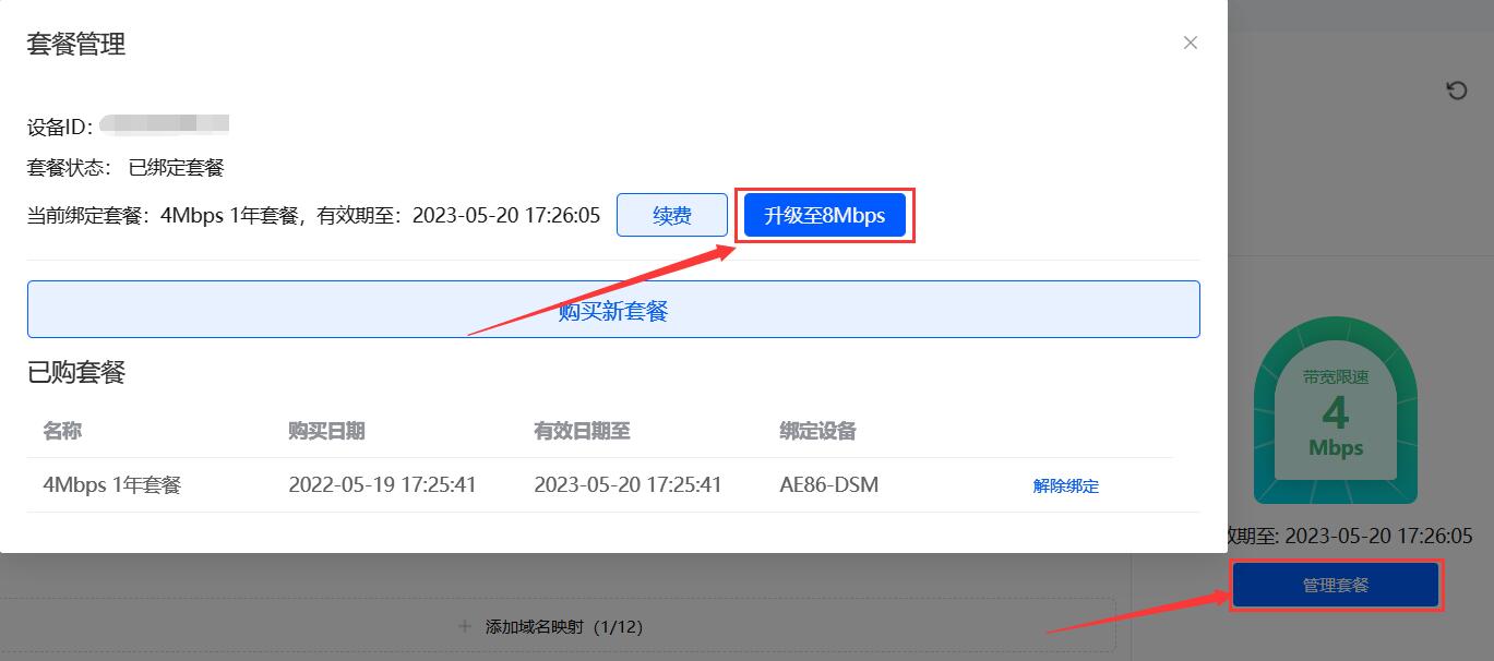 购买完成后,再次点击“管理套餐”,弹窗“已购套餐”里点击新套餐绑定即可。