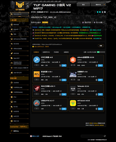 官改固件为koolcenter开发组在本帖发布的基于华硕官方TUF-BE3600_V2源代码修改而来的带软件中心的官改固件。