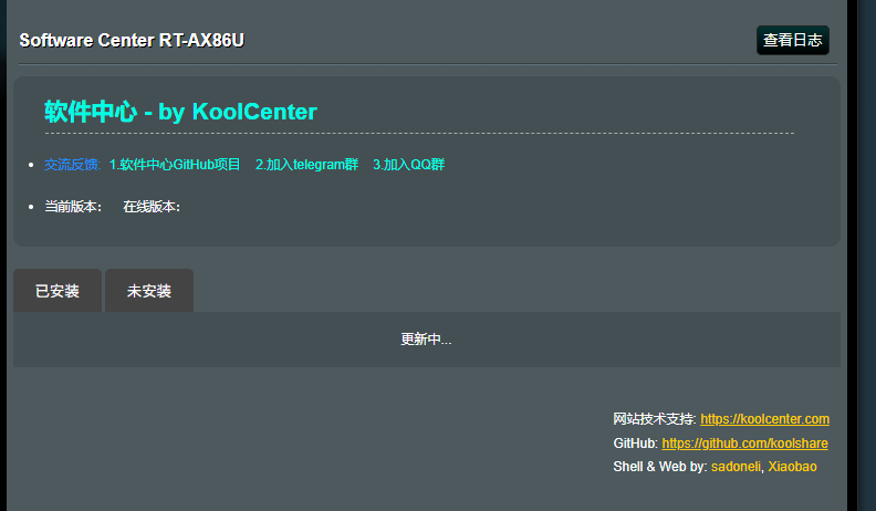 问题:今晚进入软件中心试图关闭插件,界面显示更新中无法操作,且不显示软件当前版本和在线版本