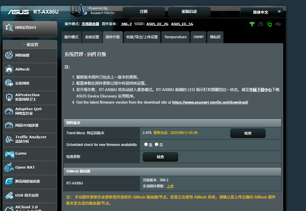 路由器型号:华硕AX86U 固件型号:梅林386.2