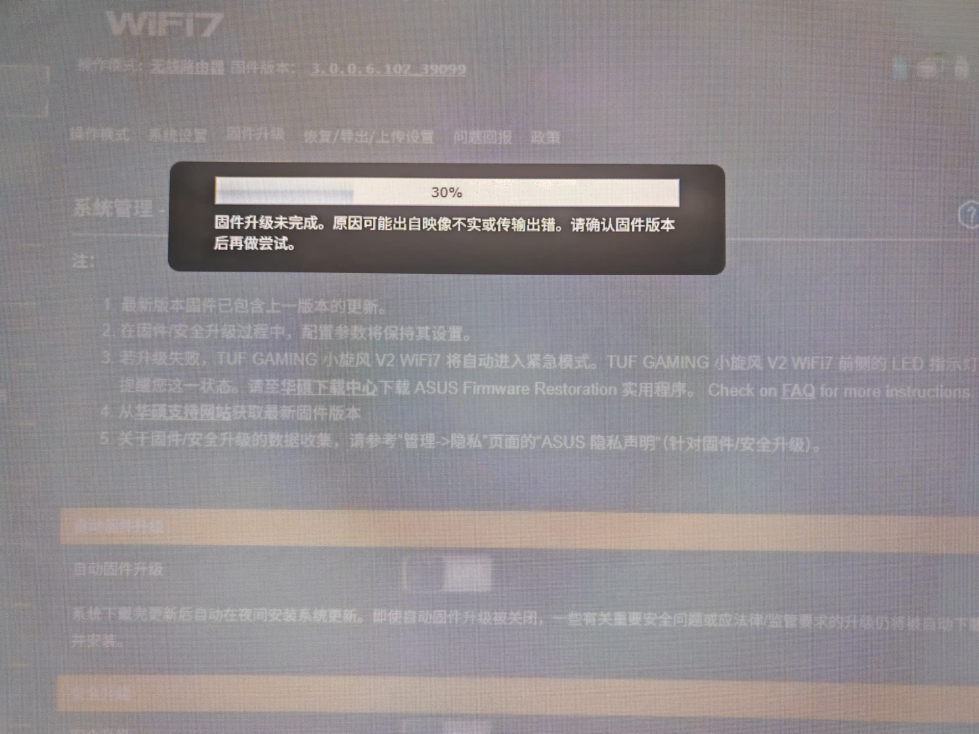 我下载官方官改固件 尝试数次 手动上传 不是卡在处理中就是固件升级未完成 然后自动回退 .头一次折腾华硕路由 有大神指点一下吗