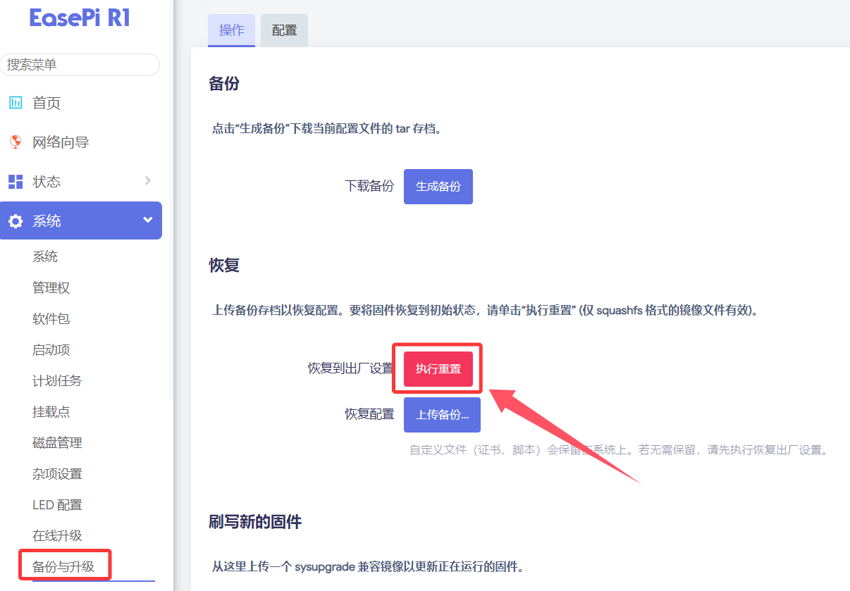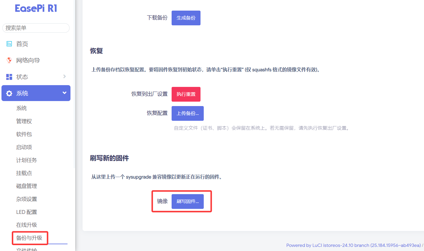 - 手动升级固件: iStoreOS ——>「系统」——>「备份与升级」——>「刷写固件」——>「浏览」选择下载的固件文件,开始刷入即可(按需决定是否保留配置)。