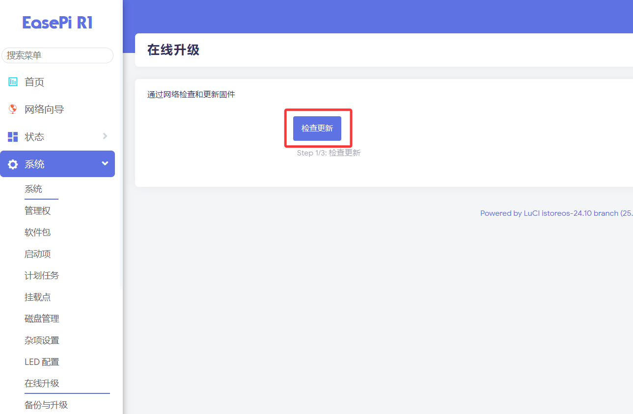 - 在线升级固件: iStoreOS 首页——>「固件更新」——>「检测更新」,如果有新版固件,检测到更新,直接「下载固件」更新即可。