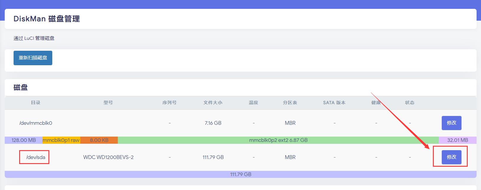 - 磁盘管理会发现一块空盘,点击空盘右边的“修改”按钮;