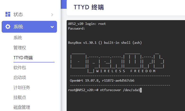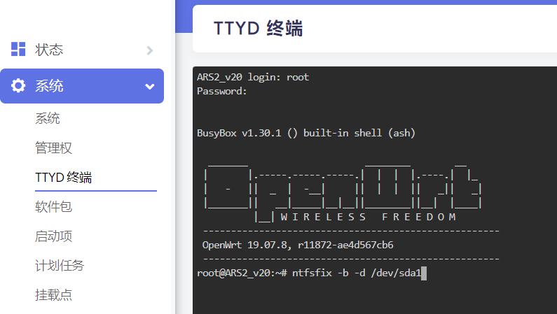 若ntfsfix命令不存在,升级固件到’19.07.8 r11872’或者之后版本再试。