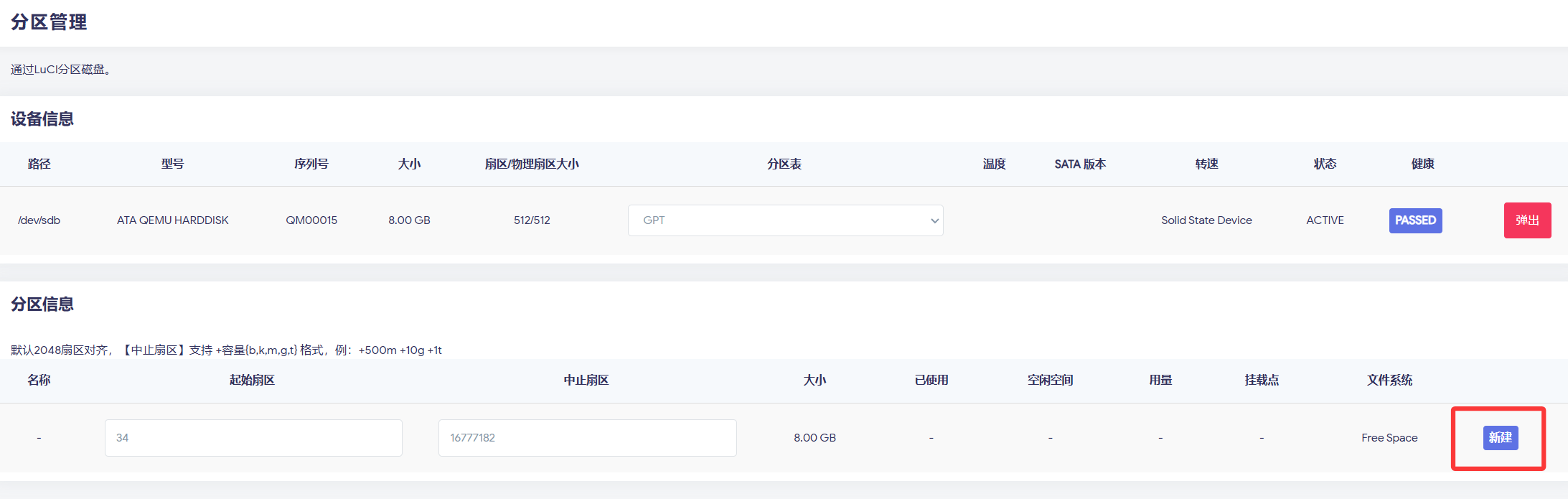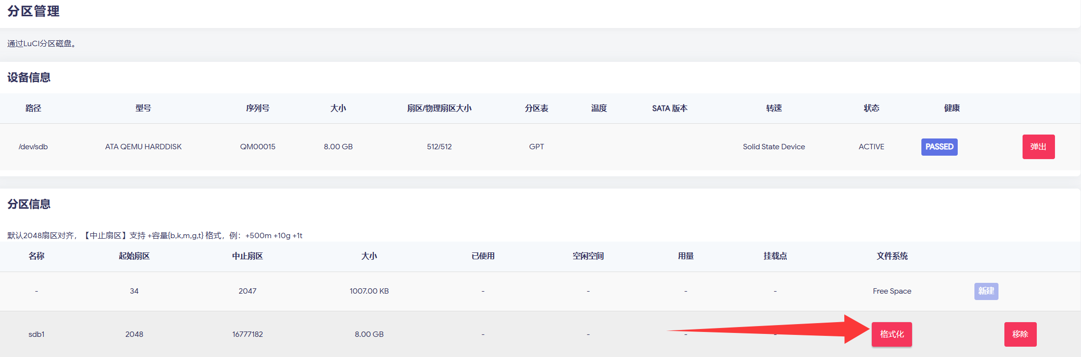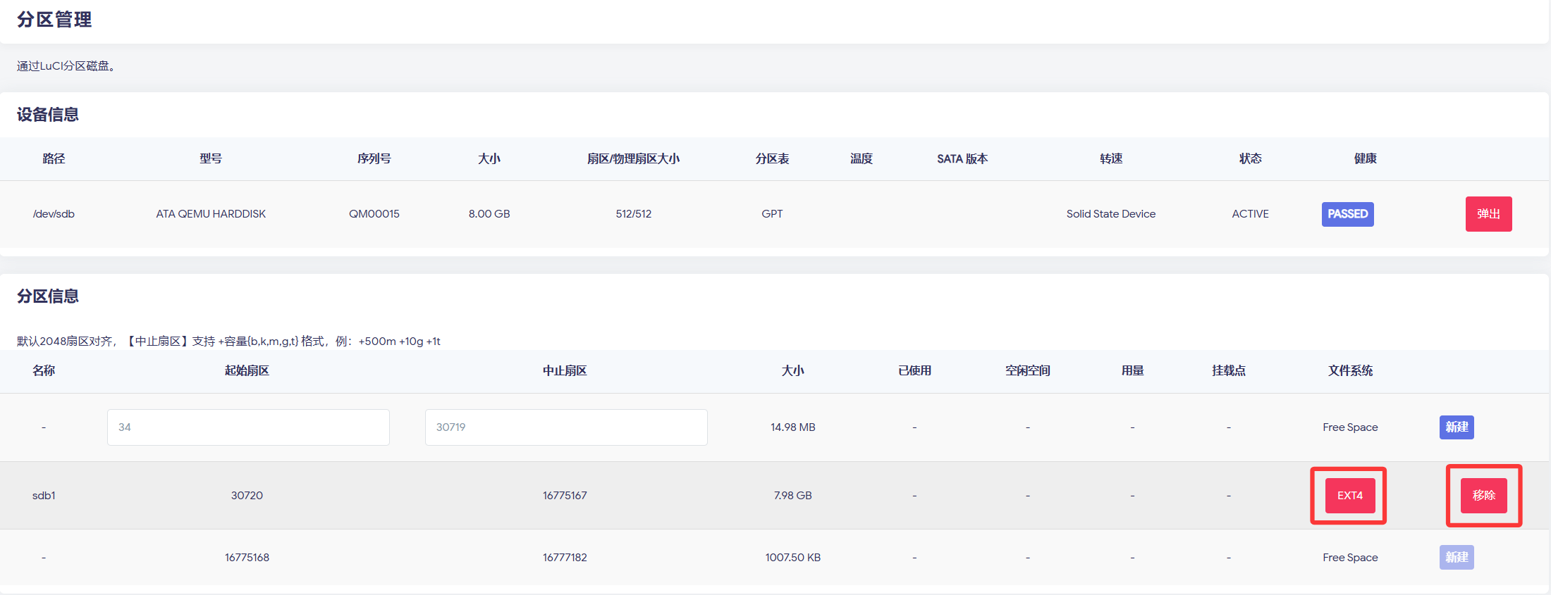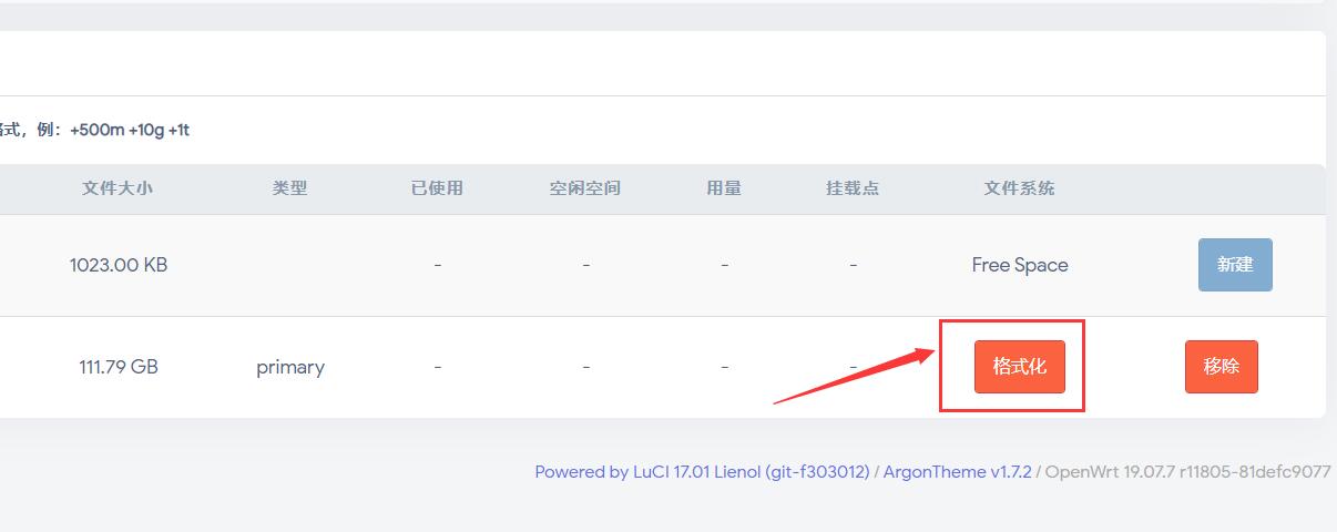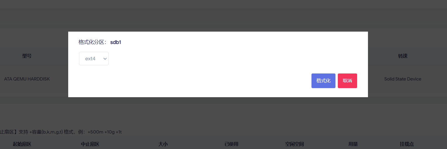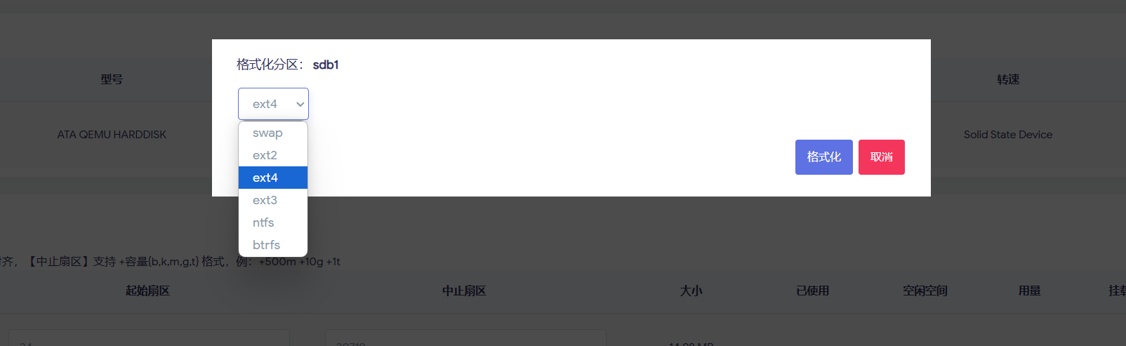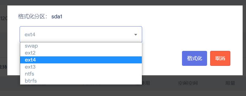 - 新建后,点击「格式化」,选择EXT4格式,完成格式化即可;