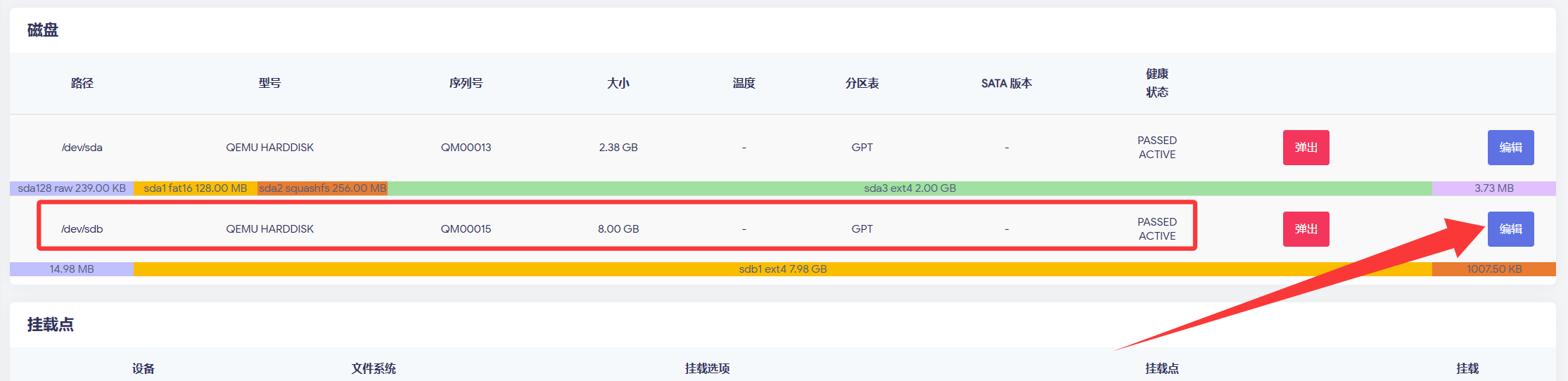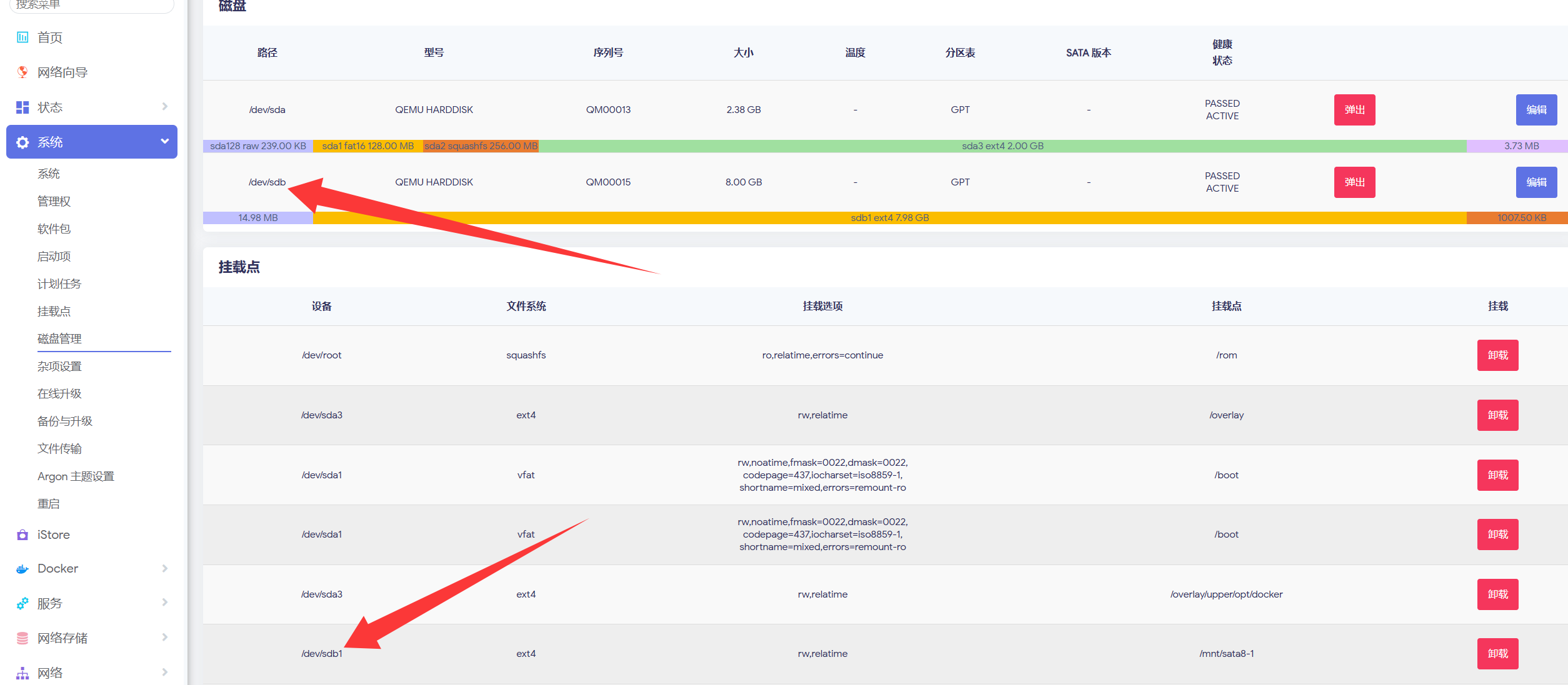 iStoreOS 首页磁盘信息板块,就能发现需要格式化并挂载的硬盘;