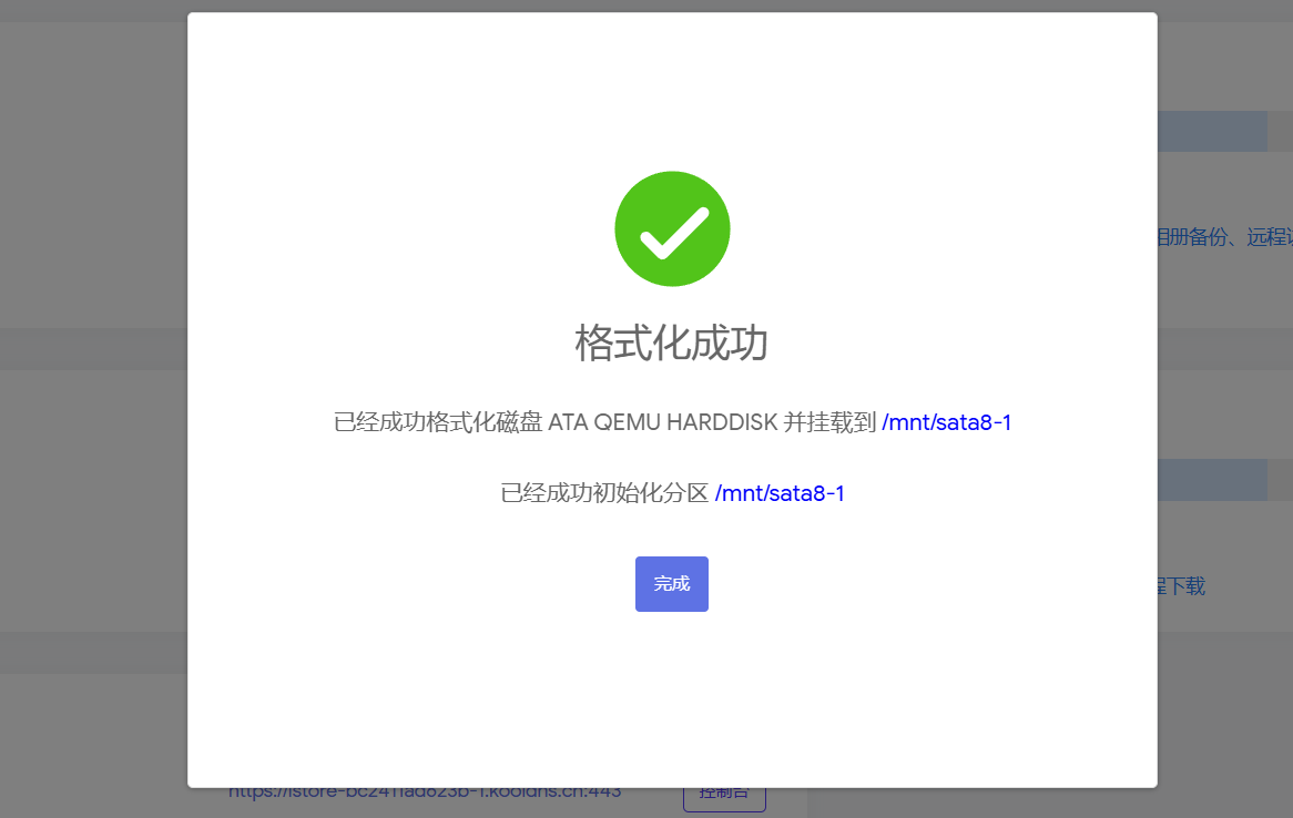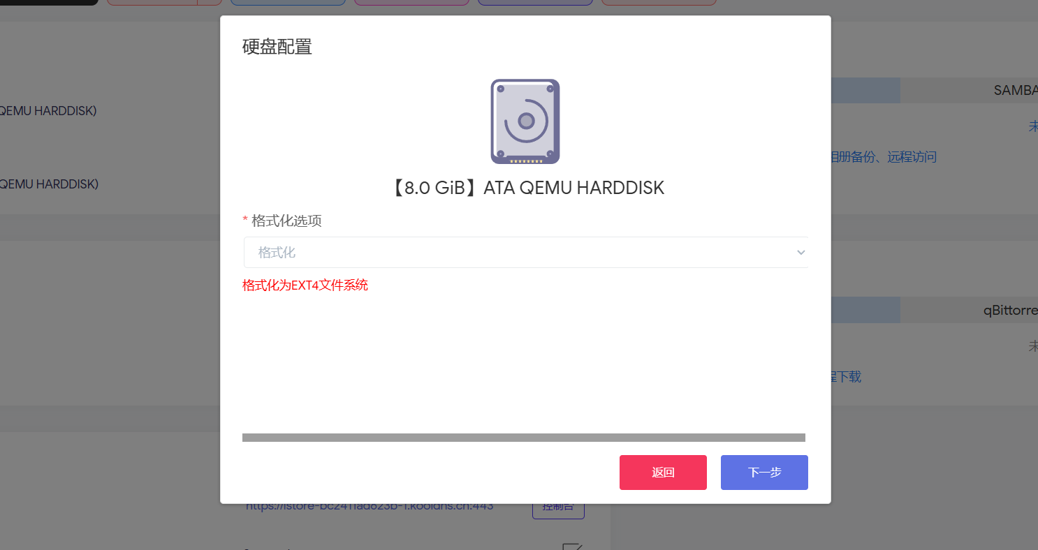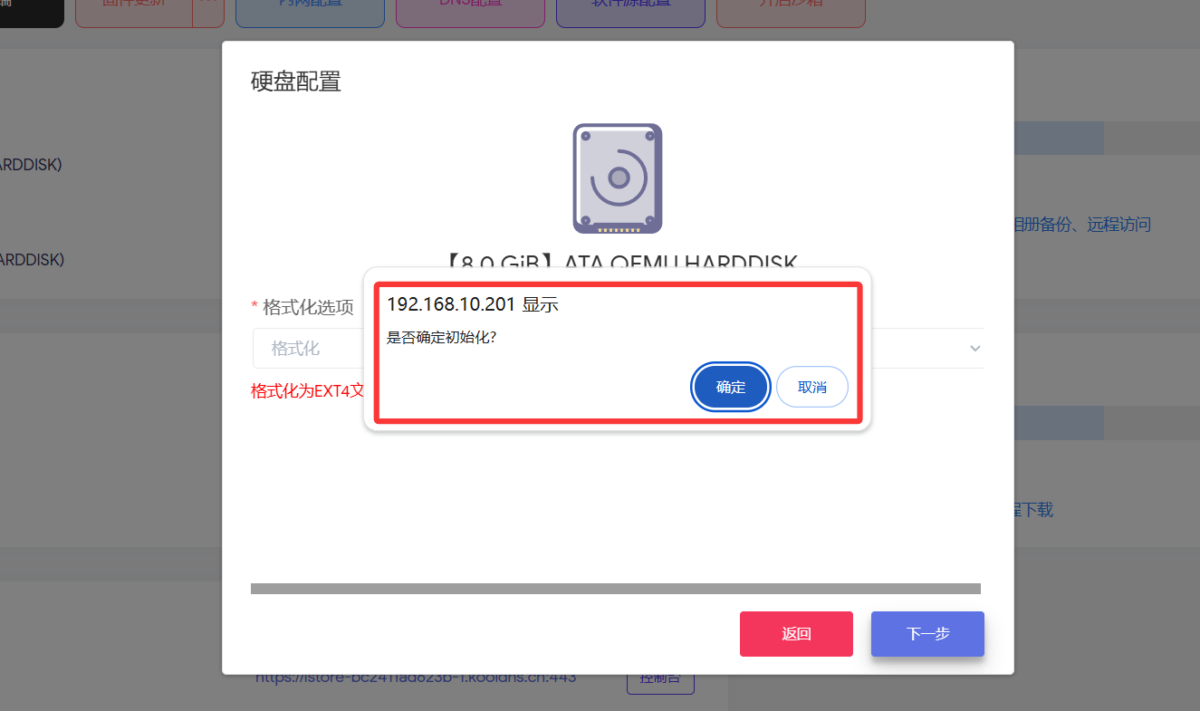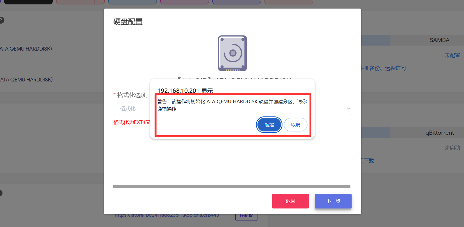 - 直接点击「已挂载磁盘」识别出来的磁盘,点击格式化并挂载(如果多块硬盘,一一点击),点击下一步,默认会格式为EXT4格式,然后是各种弹窗,点击确定;