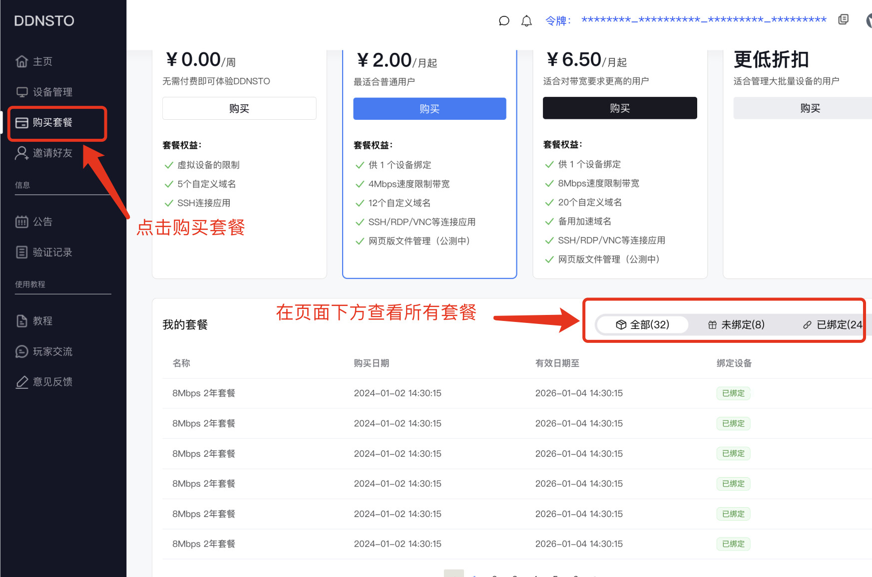 1、付款成功后将会发放对应数量套餐至账户名下并开始生效计时,需要在「套餐管理」页手动绑定设备。