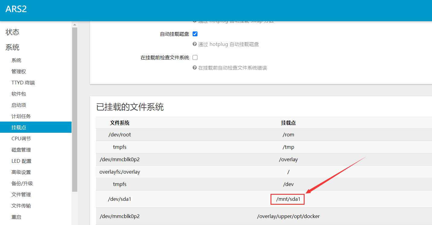 1.进入管理界面,打开系统——挂载点,找到硬盘的挂载点: