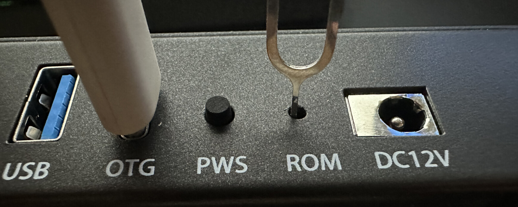 首先A2断电(拔掉DC接口);准备USB-C数据线,一端接入电脑,数据线C口接入A2的C口(OTG);然后用顶针持续顶住ROM口;