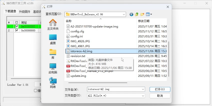 下载镜像——> Loader,选择适合A2(RK3568)的文件,选择2.86刷机工具自带的第一个文件即可;