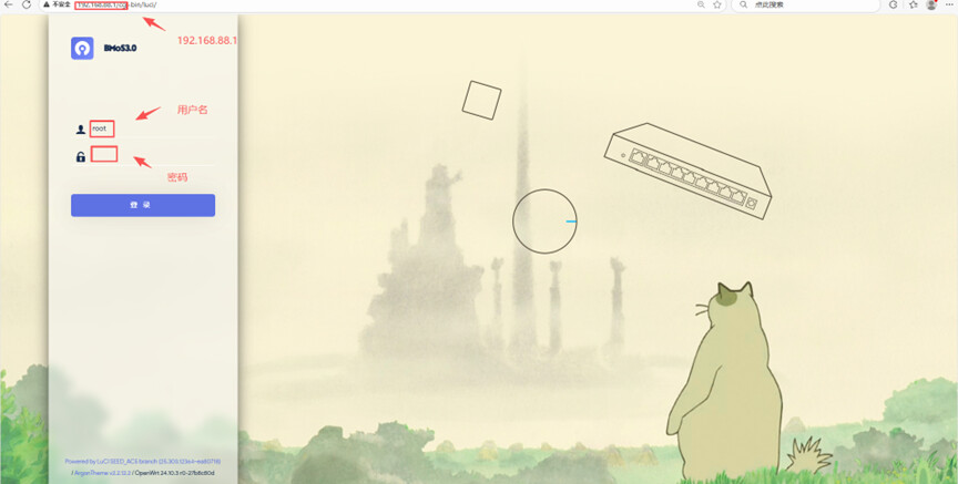 2.浏览器打开输入192.168.88.1默认用户名:root 默认密码:password