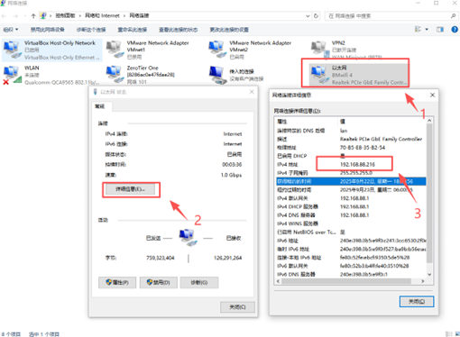 (3)当数据灯亮正常情况下,电脑进入网络配置查看是否获取到IP地址?
