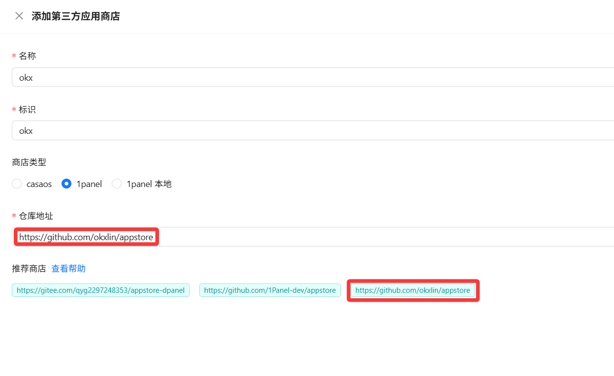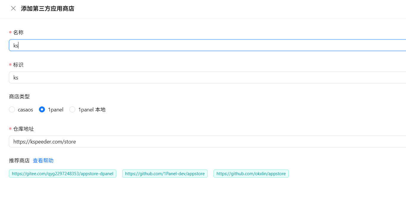 商店类型选择「1panel」,底部也有三个推荐的商店,都可以添加;