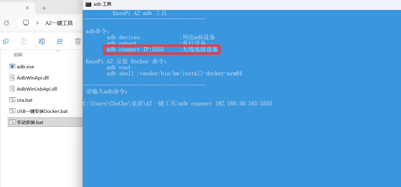将IP替换成功自己A2的IP,在「手动安装」窗口输入命令,即可无线ADB连接A2;