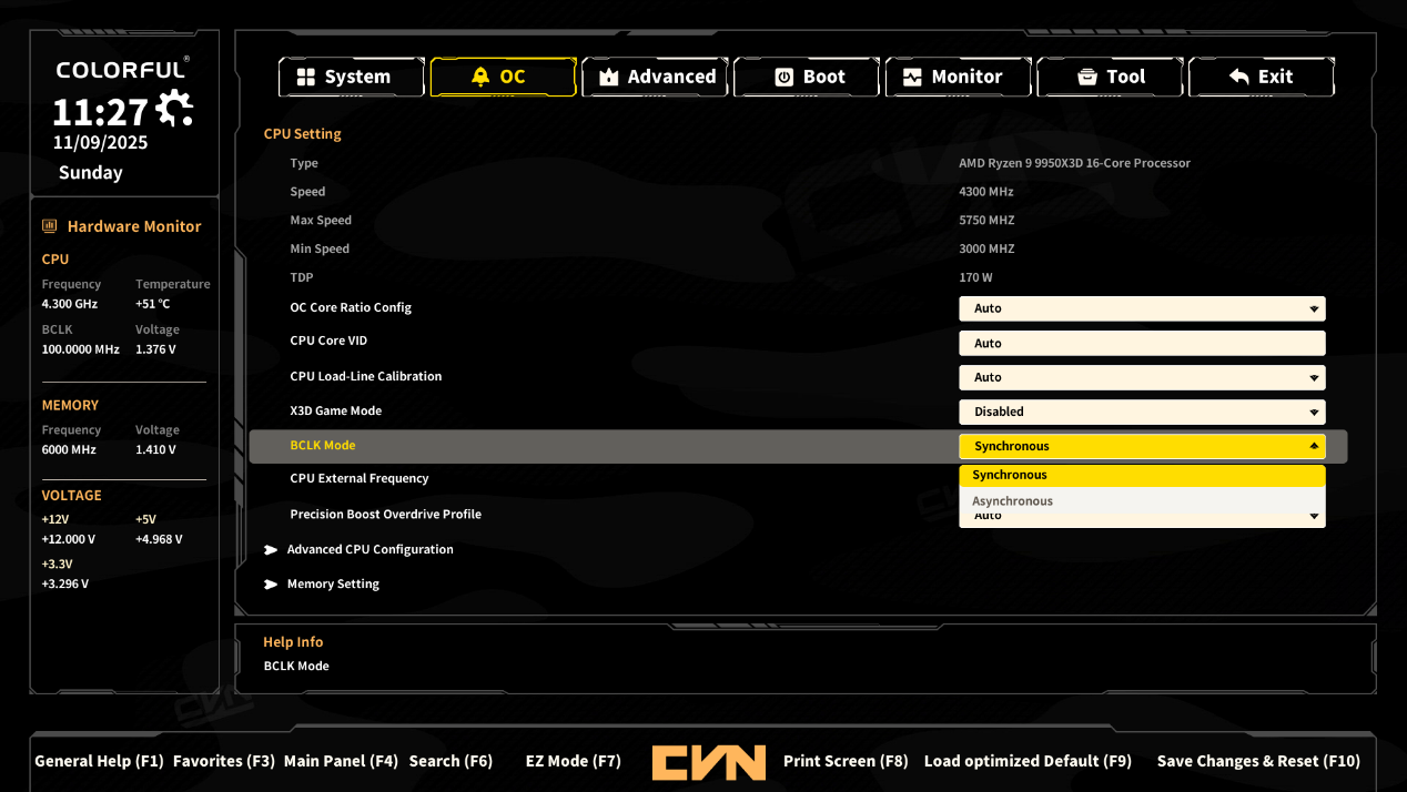 - CPU External Frequency(CPU外频):因BCLK Mode当前为同步模式,此处显示“Synchonrous”,若切换到异步模式,可在此手动调整外频数值以实现超外频操作。