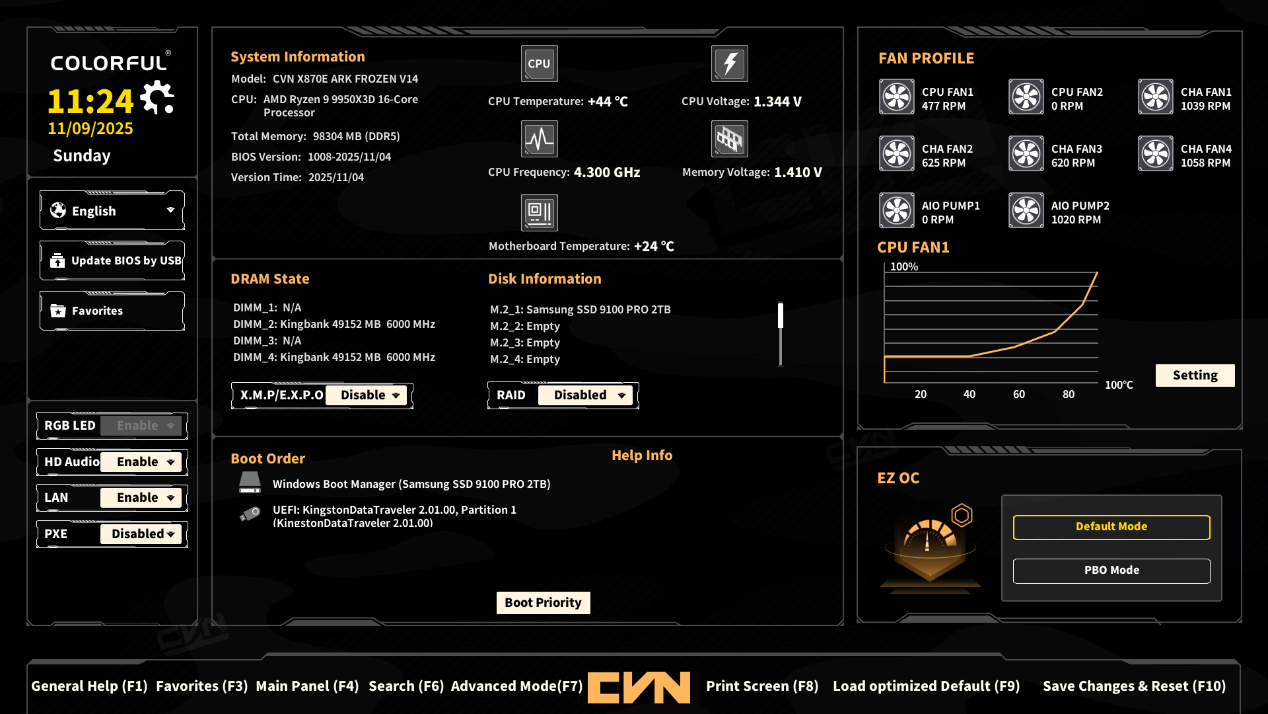 ▲开机按Del进入BIOS,首先来到的是EZ模式界面,在这里可以看到当前的硬件信息,对BIOS升级,启用XMP/EXPO功能,设置风扇曲线,以及启用AMD的PBO模式。