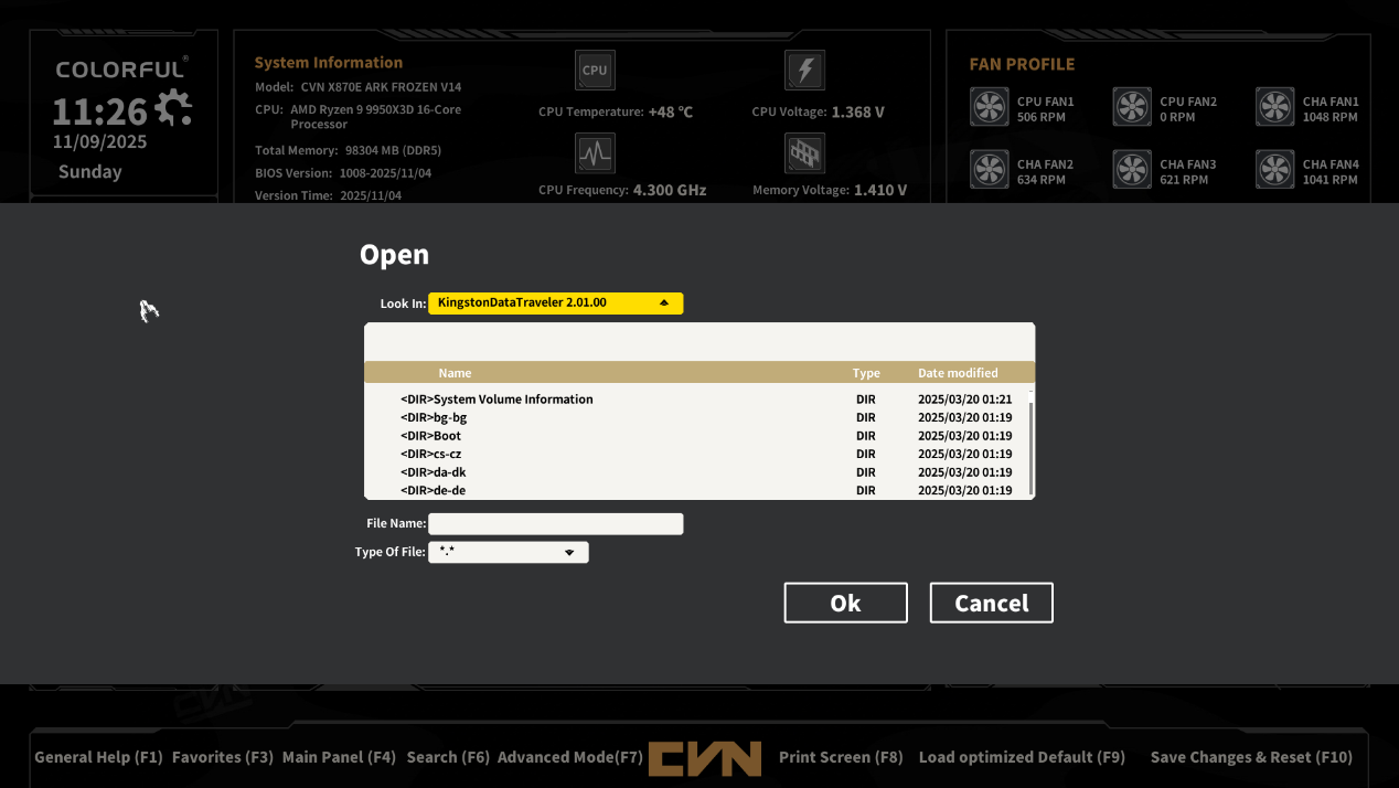 ▲通过U盘内存储的BIOS 升级文件,根据界面指引,选定文件完成主板 BIOS 升级操作,方便快捷。
