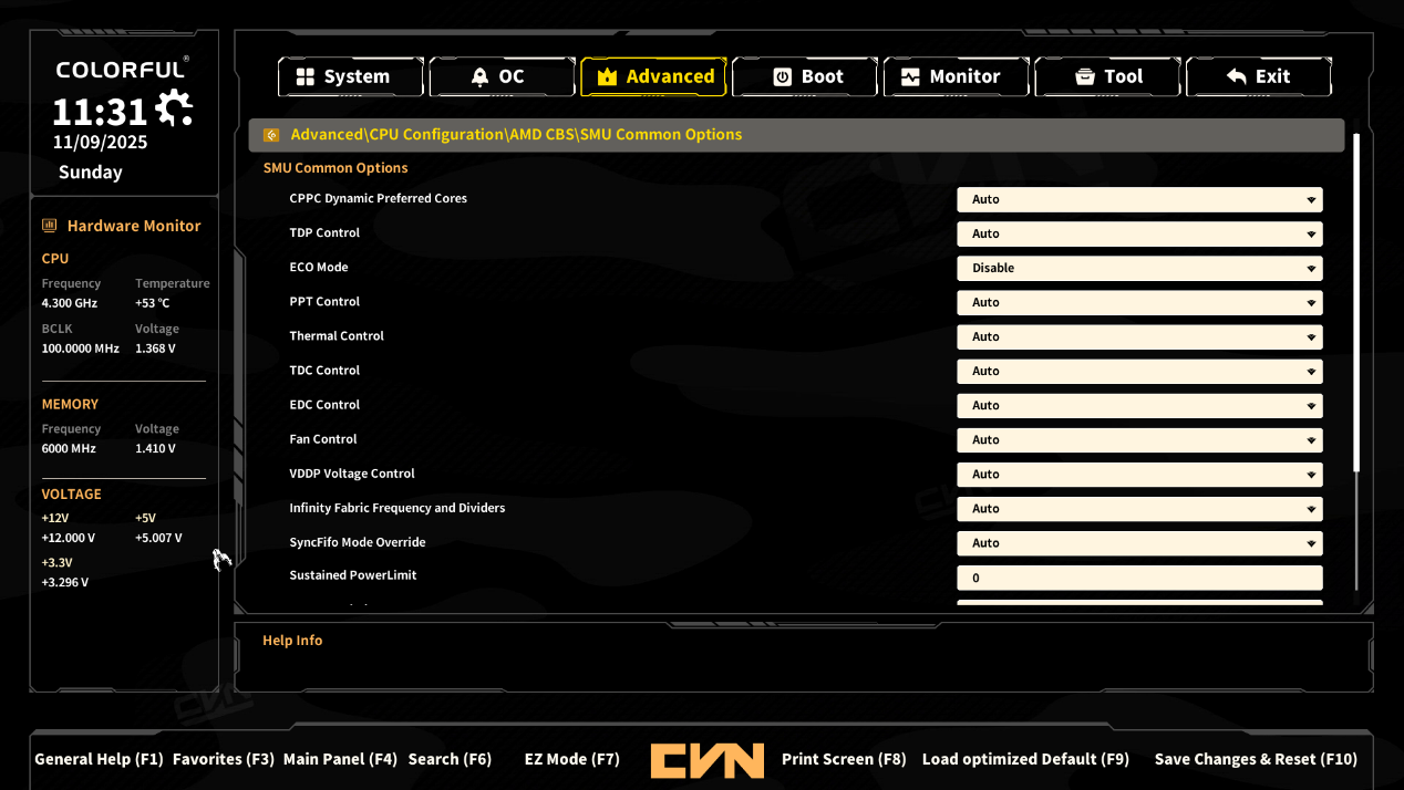 ▲SMU Common Options选项,在这里可以对CPU功耗、节能模式、温度控制、风扇控制,以及电压、总线频率等核心参数进行精细化设定。既可以保持 “Auto” 自动模式让主板智能调控,也能手动调整以实现性能超频、功耗限制或静音优化等个性化需求,是进阶调校 CPU 性能与稳定性的核心区域。