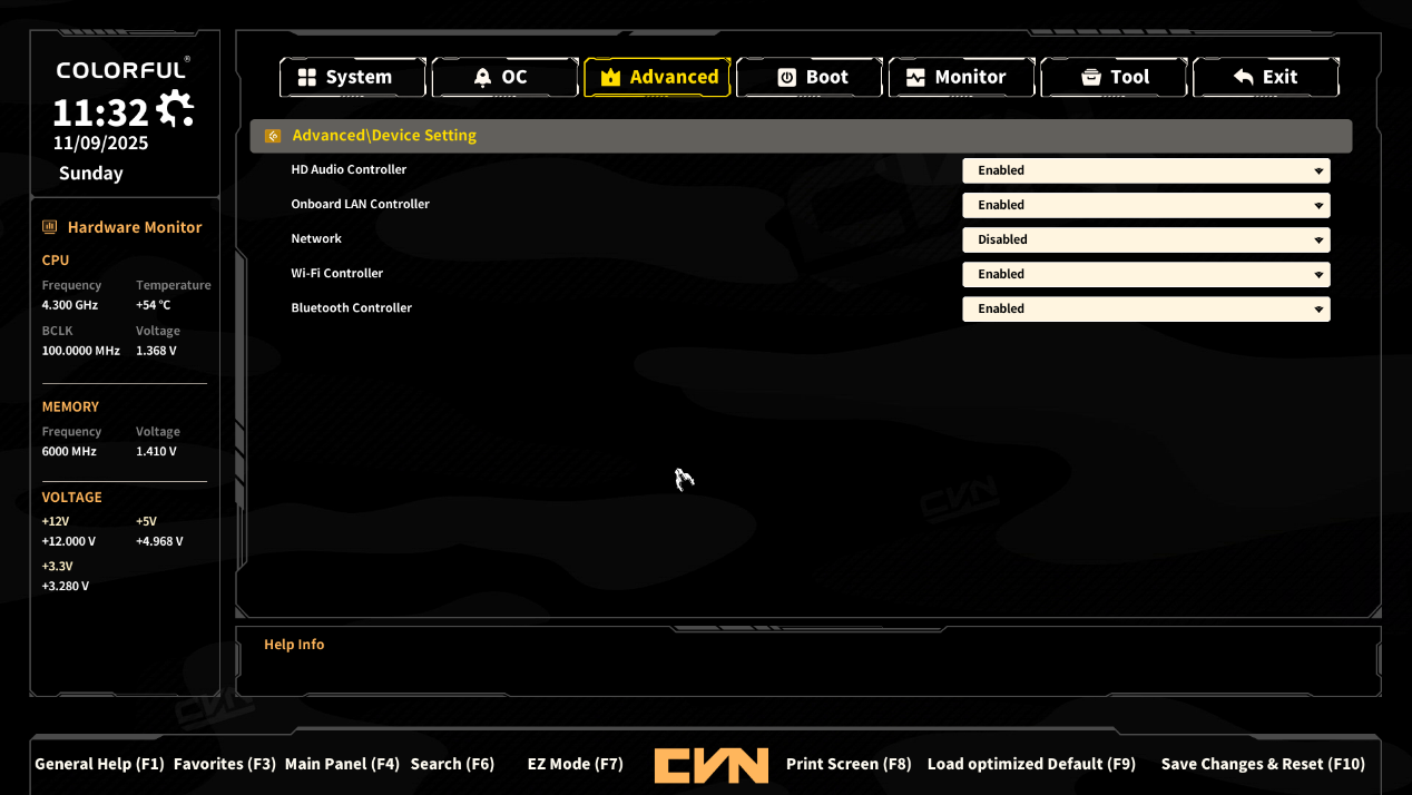 ▲Device Setting中对主板上的音频,有线网卡,WiFi网卡,蓝牙等设备进行开启或者关闭。既能让板载设备正常工作以满足音频、联网等日常需求,也能在 “外接独立硬件” 或 “优化系统资源” 时,通过禁用板载设备避免冲突、精简系统负载,适配更多个性化使用场景。