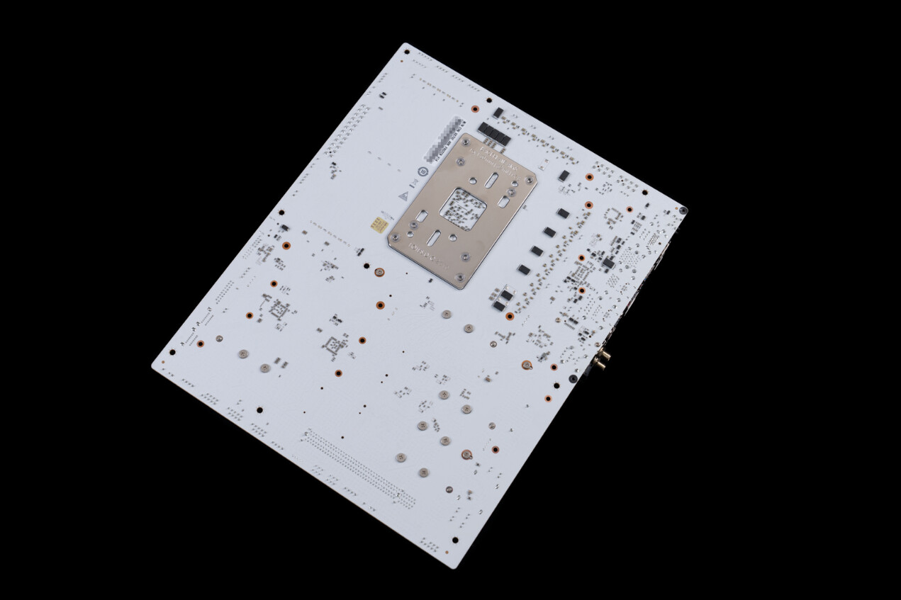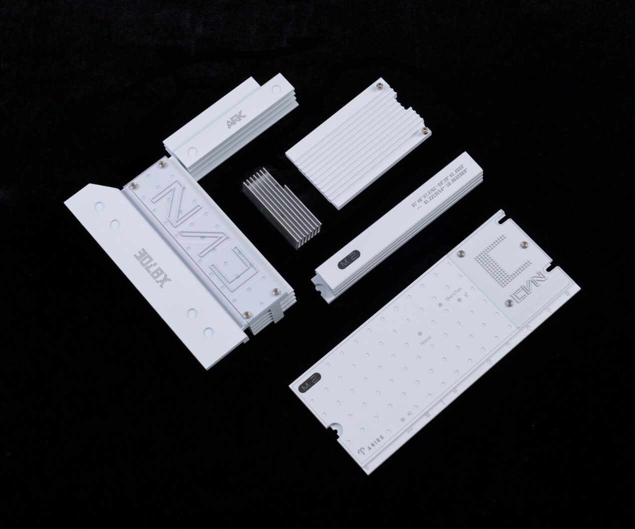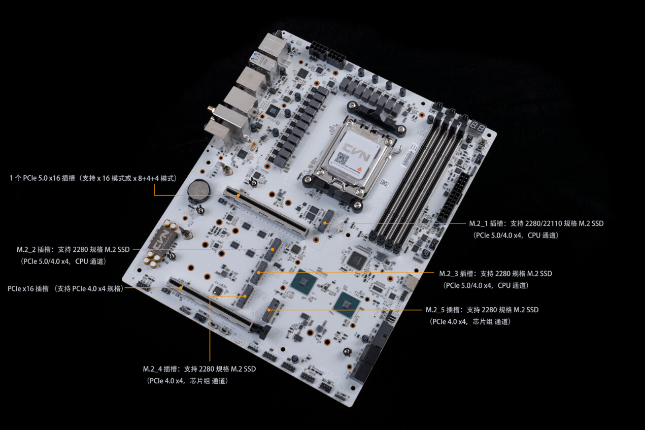 ▲拆除主板正面散热装甲一览。CVN X870E ARK FROZEN V14方舟为双面颗粒的SSD加入了铝合金背板辅助散热,可同时覆盖SSD正反两面颗粒,大幅提升热传导效率。即使面对 PCIe 5.0高速固态的高发热场景,也能有效压制温度。