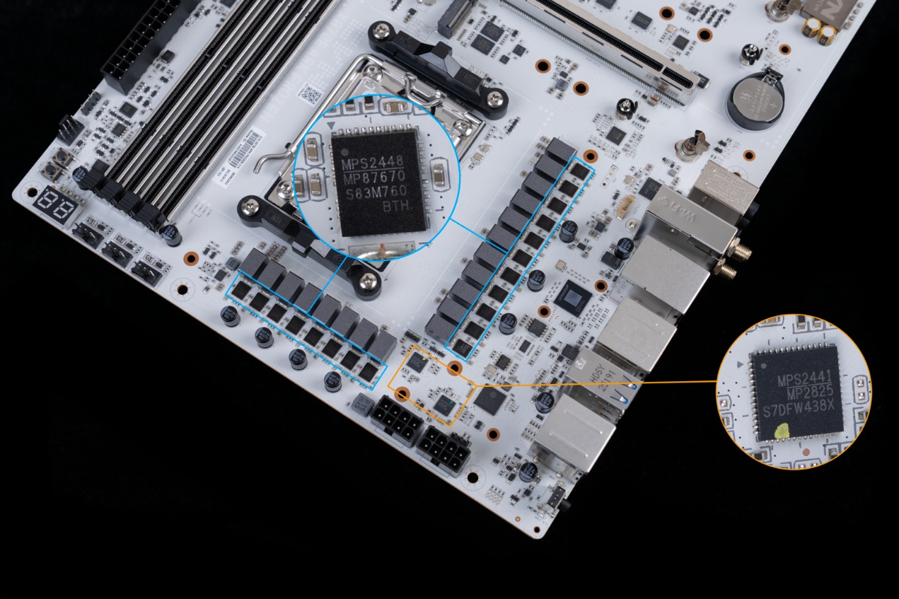 - 主板通过2颗MP2825控制器,实现并联16(VCORE)+2(SOC)+1(MISC)相供电。