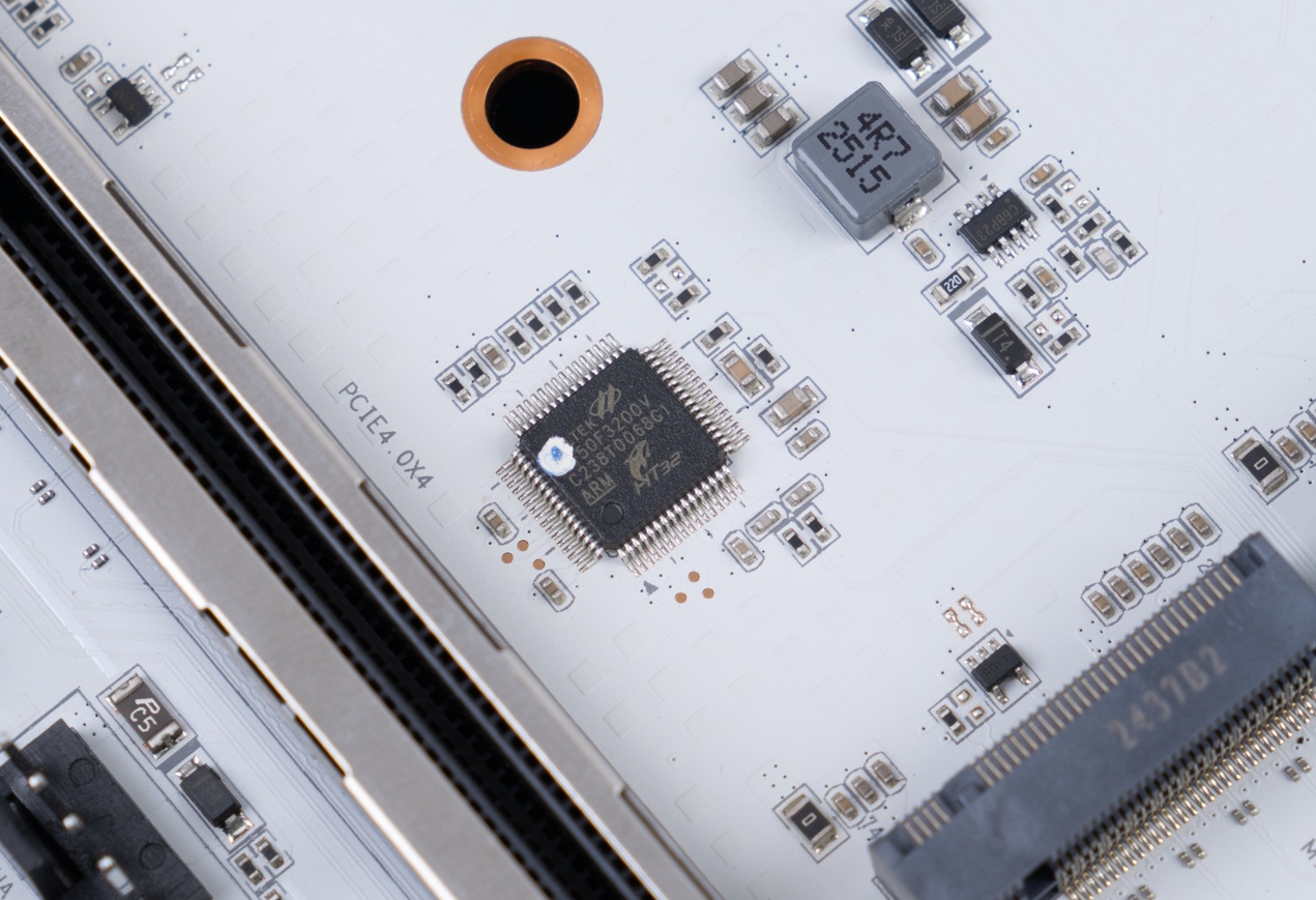 ▲VRM 区域集成了LED灯板并加入了热管辅助散热。 LED灯板可与整机ARGB设备光效联动,为白色主题装机增添炫酷视觉效果;热管则能高效传导供电模块的热量,配合大面积寒霜散热装甲,即便在锐龙9旗舰CPU满负载超频时,也能让供电区域温度保持稳定,从根本上保障硬件的长期稳定运行与性能释放。