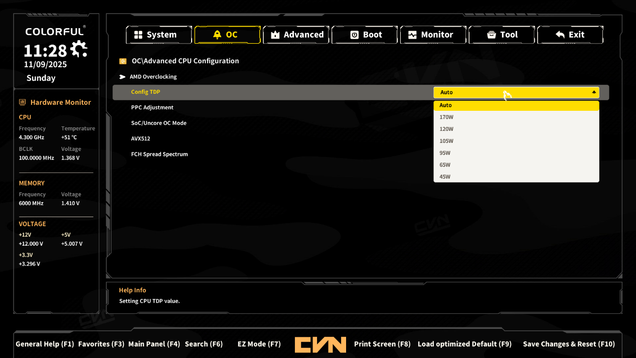 - Config TDP:配置热设计功耗(Thermal Design Power),用于设定 CPU 的功耗上限,可选择自动(Auto)或手动指定功耗档位(如 170W、120W、105W、95W、65W、45W 等),以此平衡 CPU 性能、功耗与温度表现。
