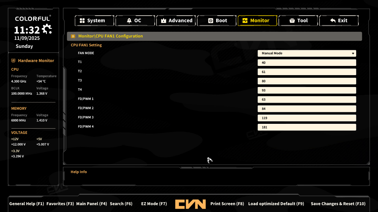 ▲CPU风扇(CPU FAN)设置;T1-T4,四个温度值;FD/PWM1-4, 设置风扇在T1-T4温度下的PWM值,PWM值越大,风扇转速越快。