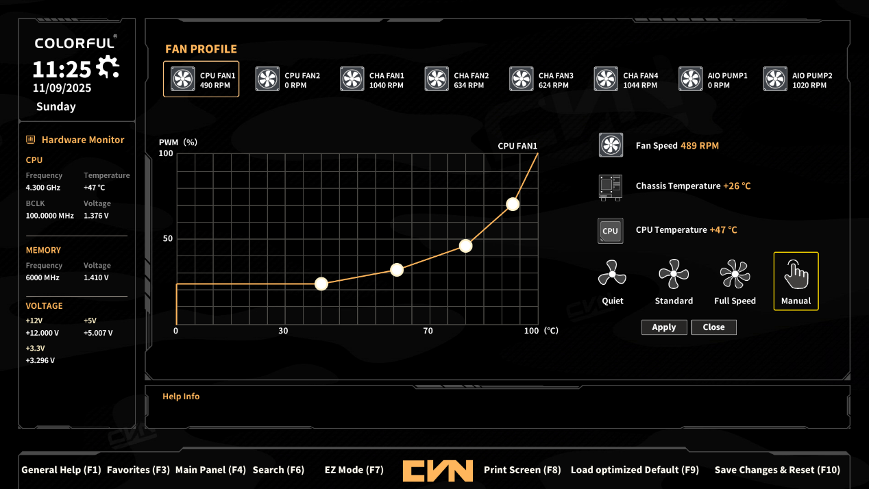 ▲风扇调控提供静音、标准、全速、手动四种模式。用户可按需快速切换模式:“静音” 模式主打低噪,风扇以较低转速运行;“标准” 模式平衡噪音与散热表现;“全速” 模式优先极限散热能力;“手动” 模式则支持用户自定义风扇曲线细节。