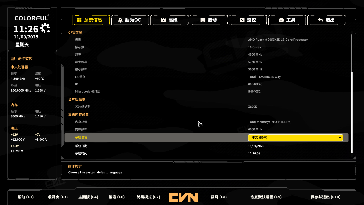 ▲按F7进入高级设置,语言切换成简体中文后,界面信息清晰易懂,系统信息、硬件状态(CPU、内存等 )一目了然,新手小白也能轻松上手,快速熟悉电脑硬件参数与基础设置,降低操作门槛。