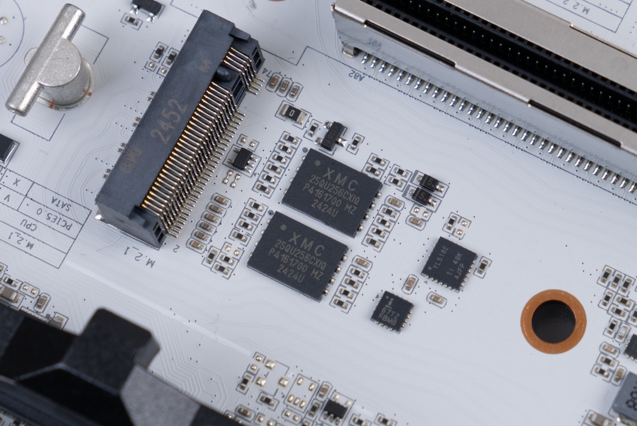 ▲XMC 25QU256CXIQ,武汉新芯(XMC)生产的 256Mb SPI NOR Flash 存储芯片,容量 32MB,用于存放主板的BIOS。因为CVN X870E ARK FROZEN V14方舟主板支持BIOS切换功能,所以这里有两颗25QU256CXIQ。