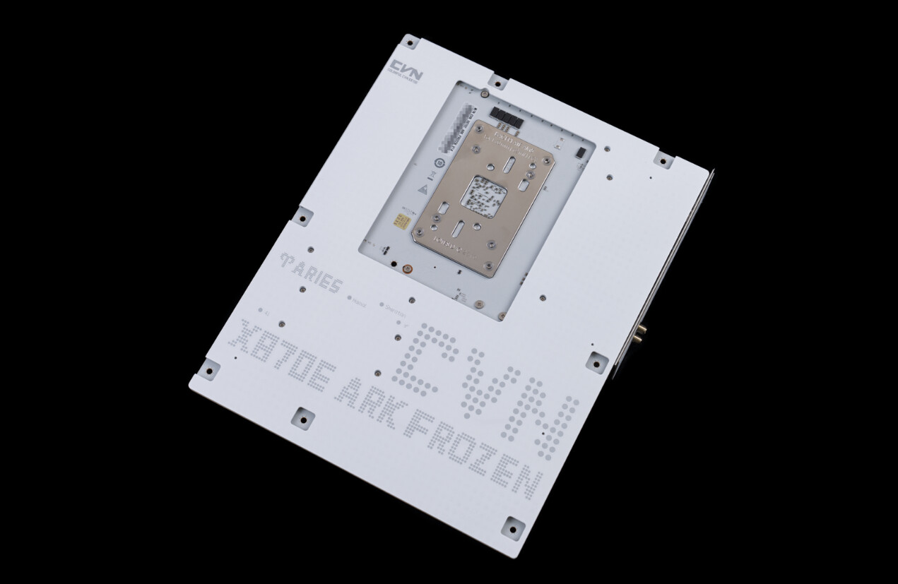 ▲主板背面配备一体式白色强化保护背甲,不仅能有效防护背面元器件免受物理损伤,还可辅助散热,提升主板长期运行稳定性。背甲上以点阵工艺呈现 “CVN” 品牌标识、“X870E ARK FROZEN” 型号及 “ARIES” 系列铭牌,设计感与品牌辨识度拉满,与正面的纯白美学风格形成呼应,细节处尽显旗舰级做工。