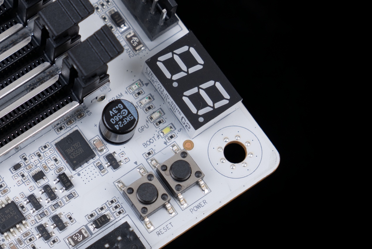 ▲主板右上角集成了开机(START)、重启(RESET)按钮,以及一块Q-Code 数码诊断屏和Debug灯,这套设计让 “裸机测试”“快速排障” 变得简单直观,是高端主板级才有的功能。