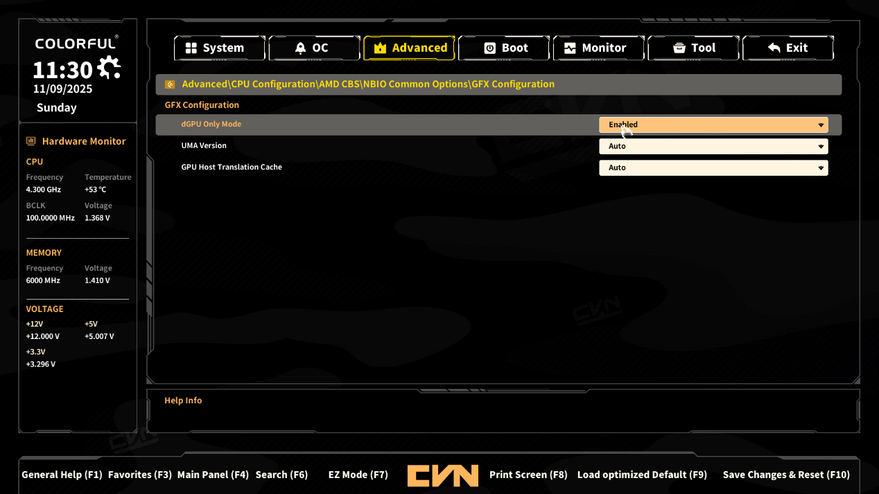 ▲GFX Configuration选项;dGPU Only Mode,启用后当检测到独立显卡则禁用核显。UMA Version,共享内存模式,可以设定共享的显存容量。