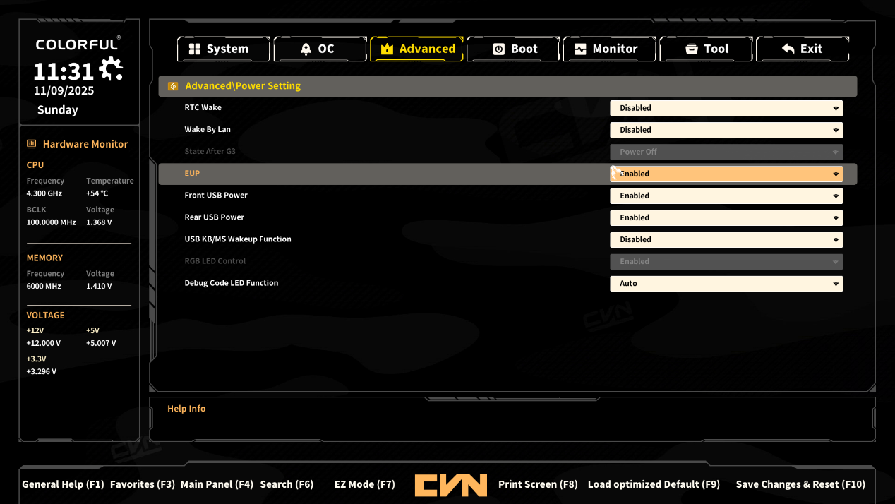 ▲Power Setting中对前置以及后置的USB接口供电进行设定,可以选择在关机后对USB接口开启或着关闭供电。启用EUP后,在关机时可熄灭主板所有灯光,同时大幅降低关机后的待机功耗,实现深度节能,符合环保节能规范。