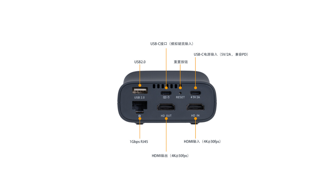 ▲GL-RM10 在接口布局上兼顾功能性与扩展性。1Gbps RJ45 网口可接入有线网络,为远程控制提供稳定连接选项;USB 2.0 接口支持外接手指开关等扩展设备;USB-C接口(模拟键鼠输入)负责连接被控设备的USB端,实现键鼠信号的模拟导入; HDMI 输入(4K@30fps)与HDMI 输出(4K@30fps)接口组,分别完成被控设备视频信号的接入与本地显示器的视频环出,保障4K画质的远控与本地查看;USB-C电源输入(5V/2A,兼容 PD)支持常规电源或PD协议设备(如充电宝)供电,部署更灵活。