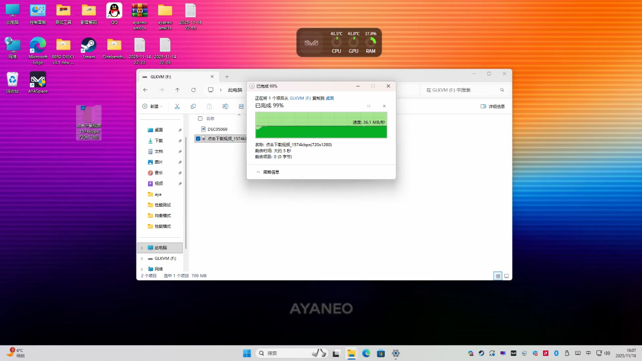 ▲从受控的AM01S向GL-RM10的EMMC取回文件,读取速度在36.1MB/s。