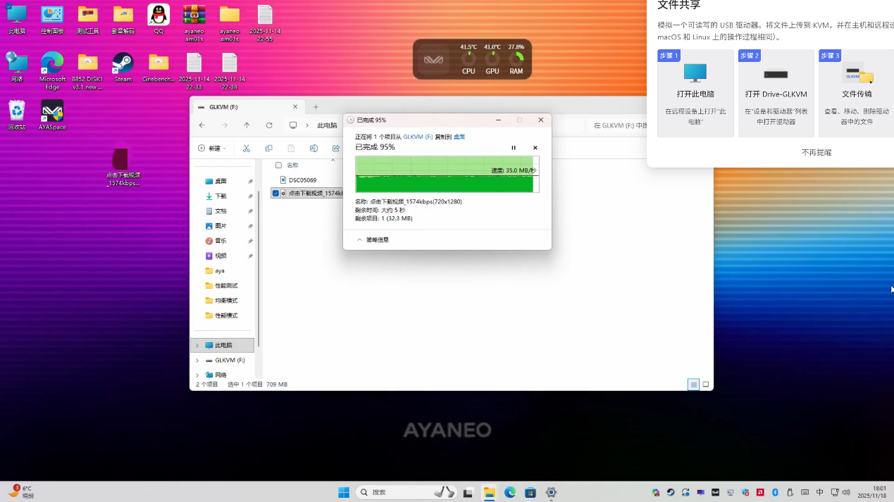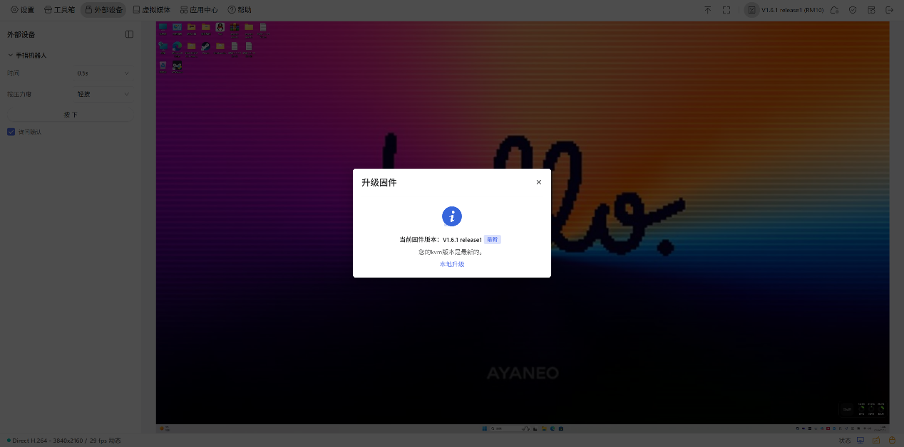 中途需要给同事传几百兆的设计素材,可以从单位PC工作站本地硬盘拖到浏览器的虚拟共享区,30MB/s左右的传输速度让文件几秒内就传送完毕,同事那边立刻能接力处理。若是遇到极端情况(比如系统完全卡死),搭配手指机器人(提前贴在工作站电源键旁),还能远程模拟 “按电源键强制重启”。
