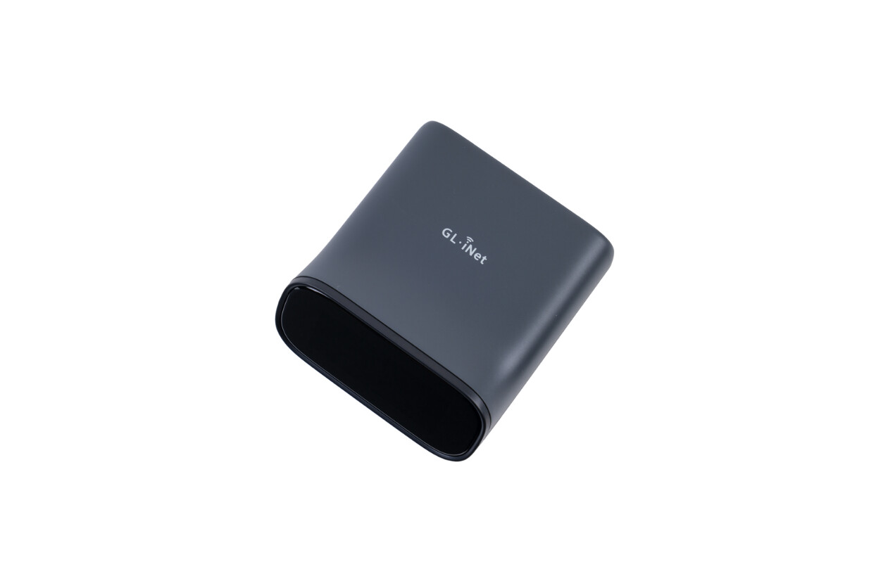 ▲GL-RM10 顶盖中央印有 GL.iNet logo,深灰色哑光材质外壳搭配流畅弧面线条,既强化品牌辨识度,又呈现出简洁干练的工业设计风格。