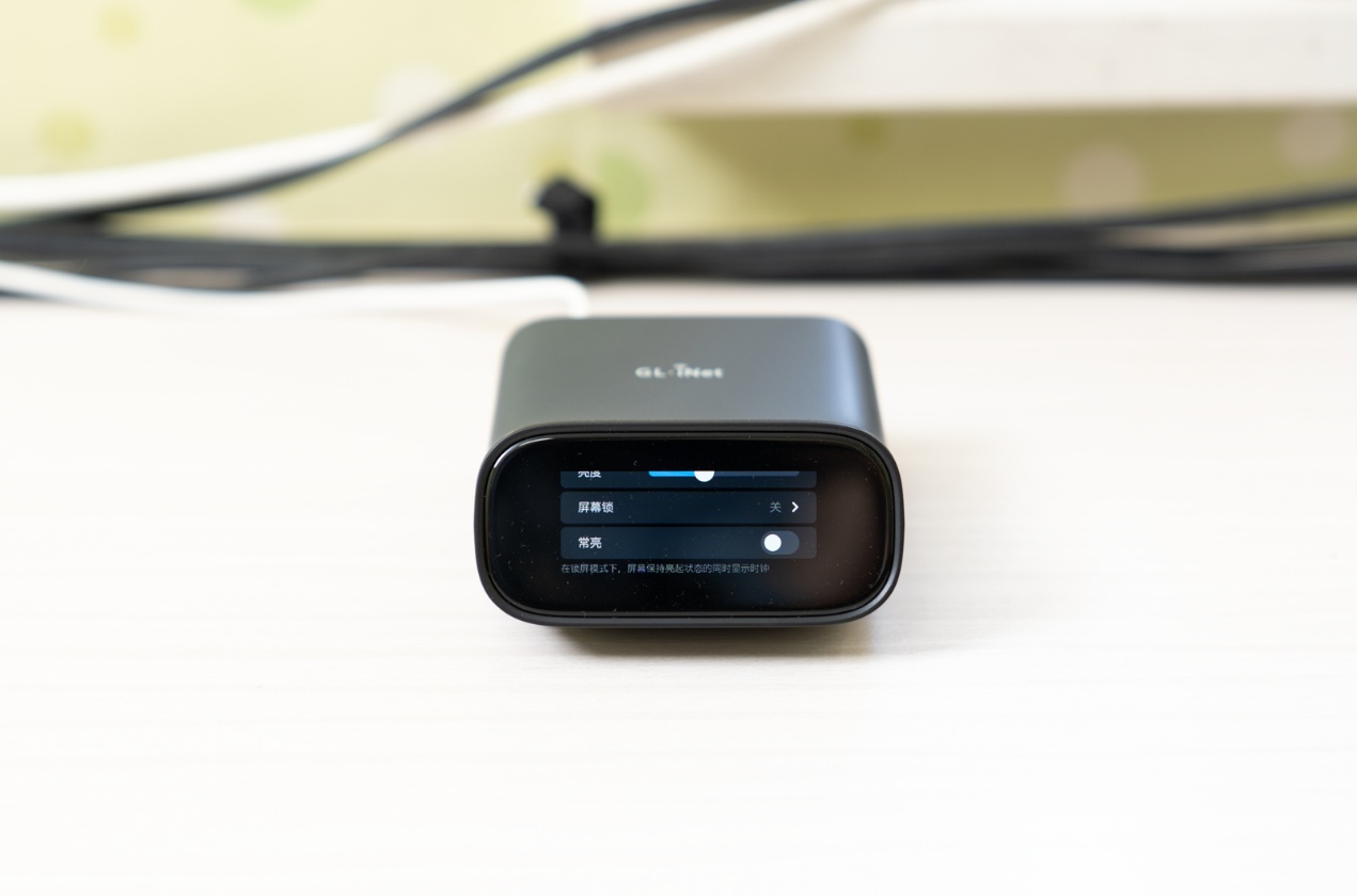 ▲GL-RM10 的 2.22 英寸触摸屏支持精细化显示设置,通过滑动条调节屏幕亮度,适配不同光照环境;同时提供 “屏幕锁” 开关与 “常亮” 模式选项。开启常亮后,屏幕将持续显示设备状态(如网络链路、接口占用等信息),避免息屏导致关键提示遗漏。