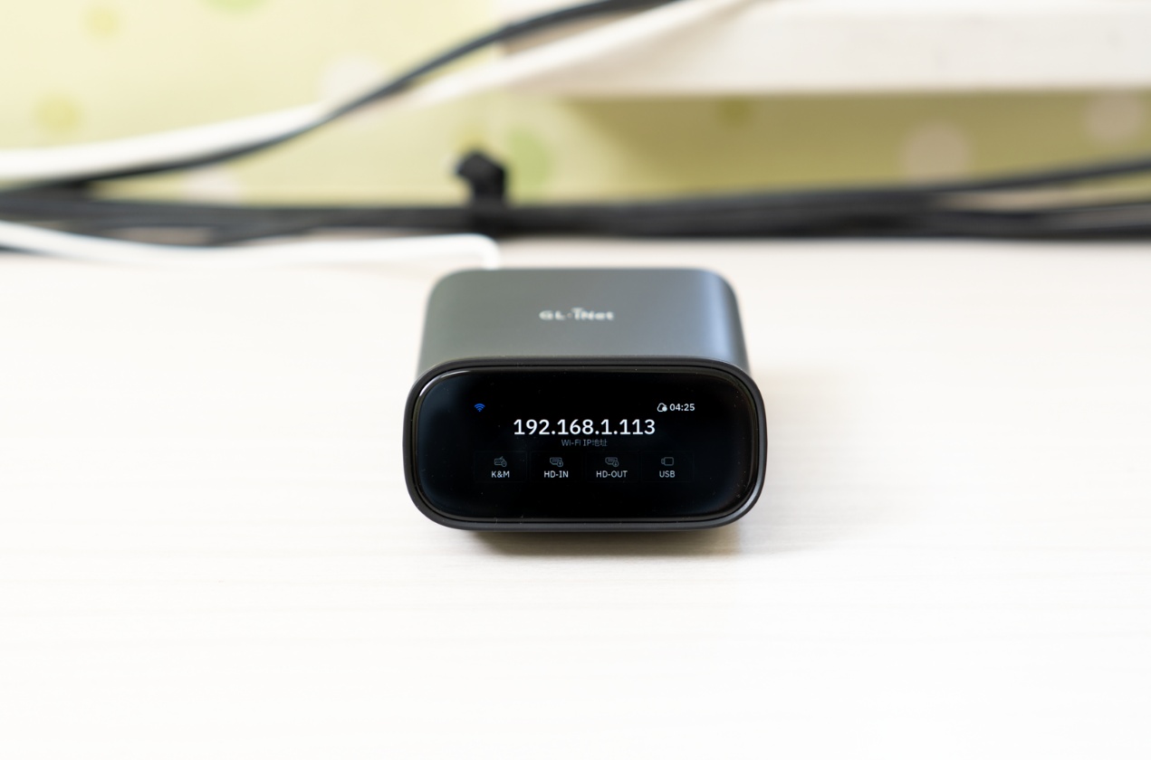 ▲连接网络成功后,2.22英寸触摸屏会清晰呈现GL-RM10的IP地址(如图中的“192.168.1.113”),同时通过图标直观反馈设备状态:左上角蓝色WiFi图标表明当前采用无线网络连接;屏幕下方的 K&M、HD-IN、HD-OUT、USB 等接口图标,若对应接口处于占用状态则会显示蓝色(如图中USB 2.0接口连接手指机器人后,USB图标即刻变蓝)。这种可视化的状态提示,让用户无需额外操作就能快速掌握网络链路与硬件接口的实时状态,极大提升了运维过程中的信息获取效率。