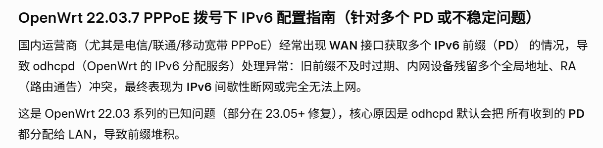 方案1:鉴于OpenWRT官方真的odhcpd做了大量修复及检索关系分析排查,问题大概率出在odhcpd中,因此将odhcpd相关修复代码合并到OpenWRT22.03.x版本序列中应可修复此问题。