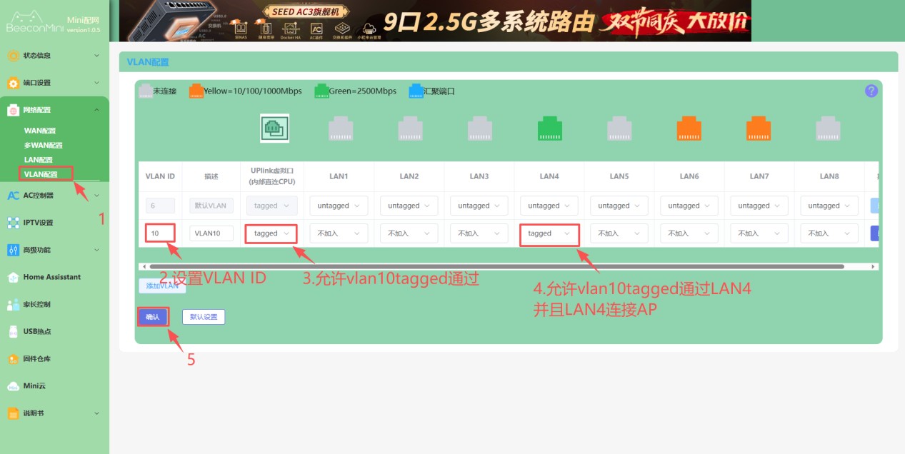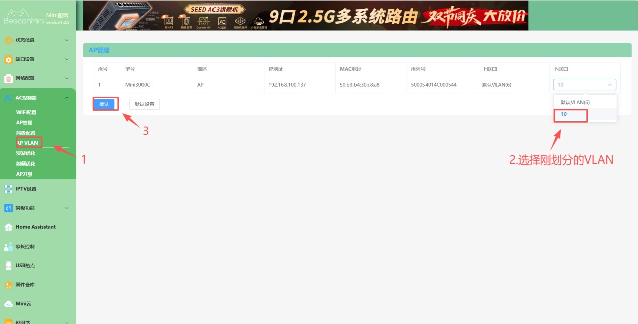 6.AC控制器:AP VLAN—下联口选择刚划分的VLAN 10—最后确认保存
