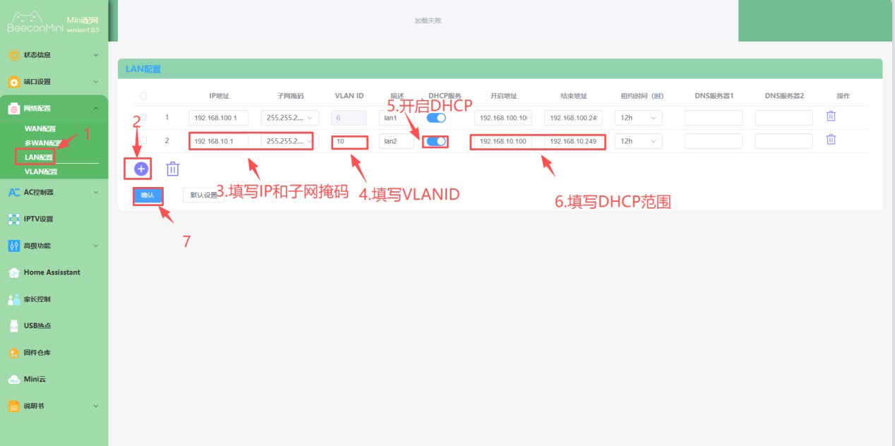 4.LAN配置:新建然后填写IP、子网掩码、VLANID、开启DHCP、填写DHCP范围